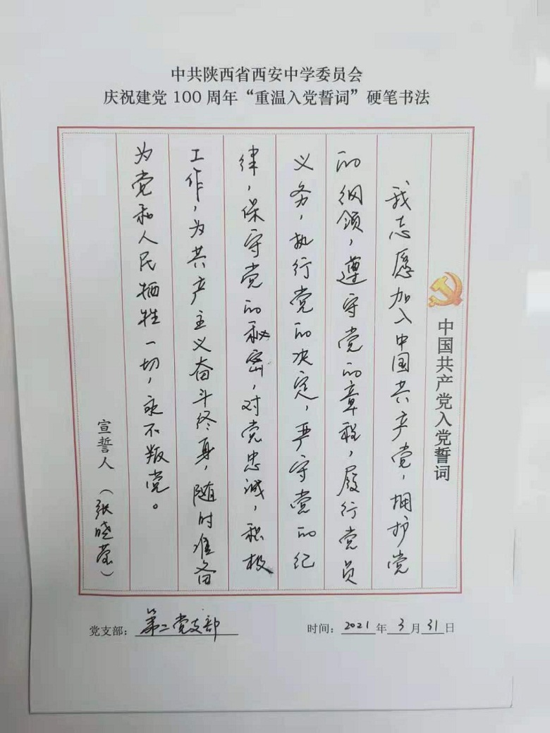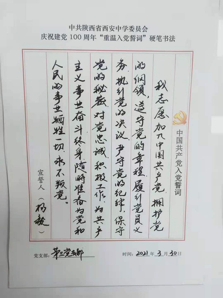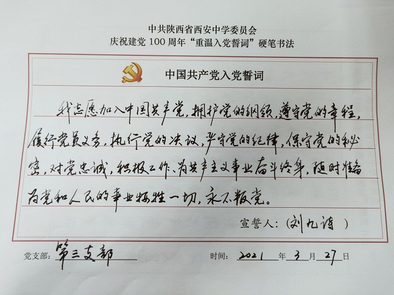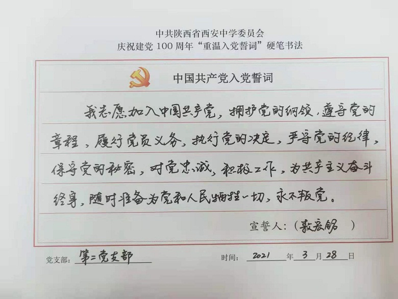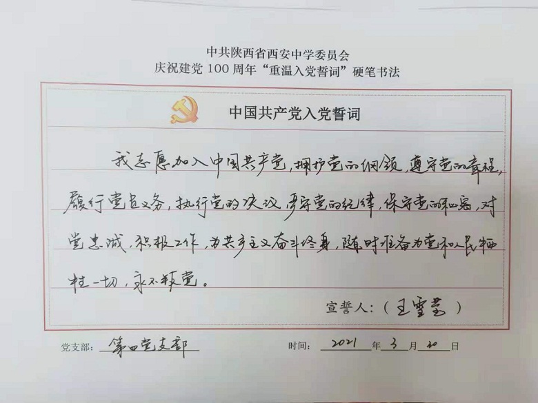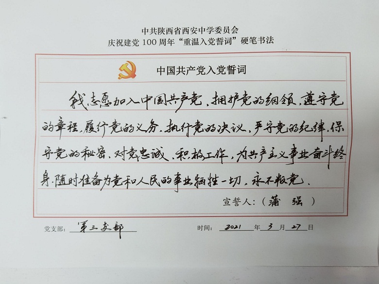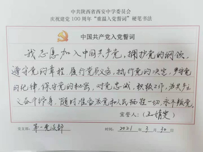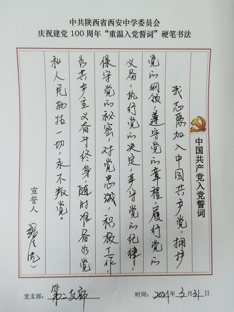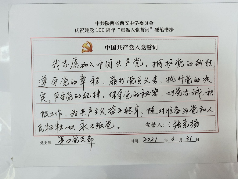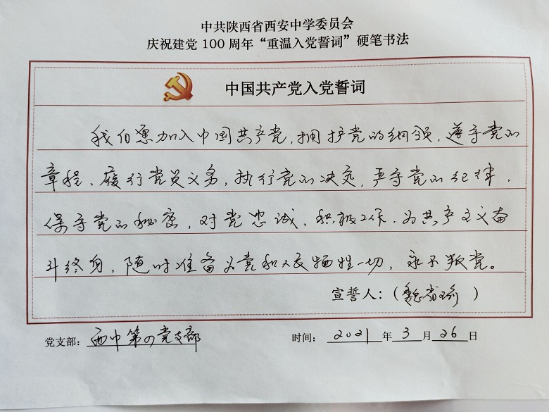 为深入开展党史学习教育,提升党员教职工的党性修养,激发全体党员尊崇党史、爱岗敬业的热情,校党委组织开展了重温入党誓词硬笔书法活动,我校四个支部全体党员参与了活动。