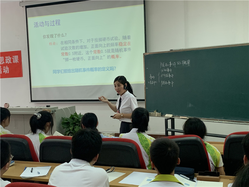 侯丽莎老师选取了《随机事件的概率》作为展示课主题。侯老师课堂结构完整,主线明晰,节奏流畅;从女排精神进行课前引入,设计了学生抛掷硬币的课堂活动,使用计算机模拟抛硬币实验,信息技术与课堂探究相结合;紧扣“随机事件的概率”这一课堂内容,引发学生自主探究热情;并将女排精神贯穿课堂始终,激发学生爱国热情,让学生体会到“锲而不舍、矢志不渝”的女排精神,提高学生核心素养。