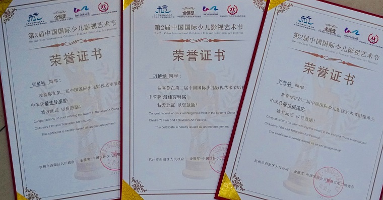 去年暑期,在我校教学处的筹划与大力支持下,我校微电影剧组公开课,顺利完成拍摄和制作,并参加了多个省级国家级比赛,取得了优异的成绩,获得了杭州的中国国际少儿影视艺术节的入围资格,本月4号,主创人员前往杭州参加颁奖典礼。