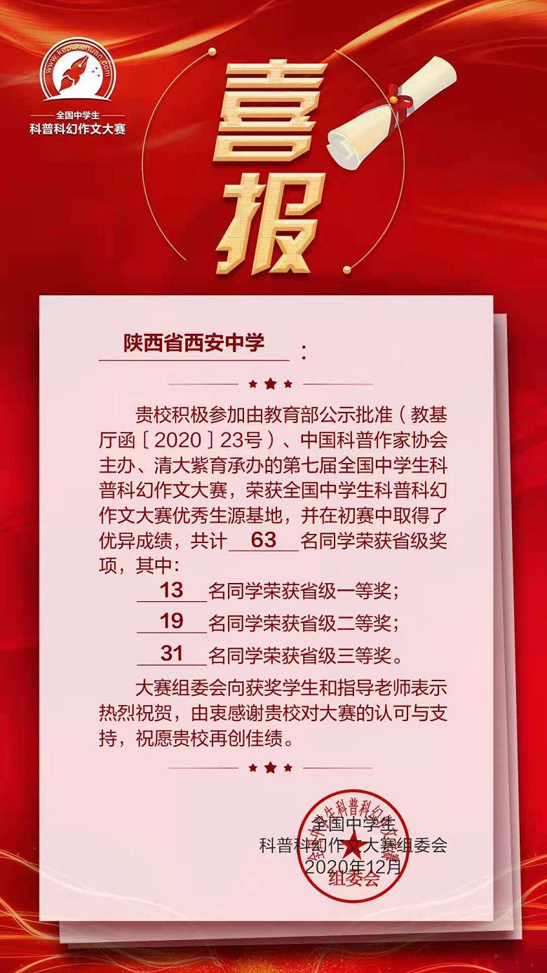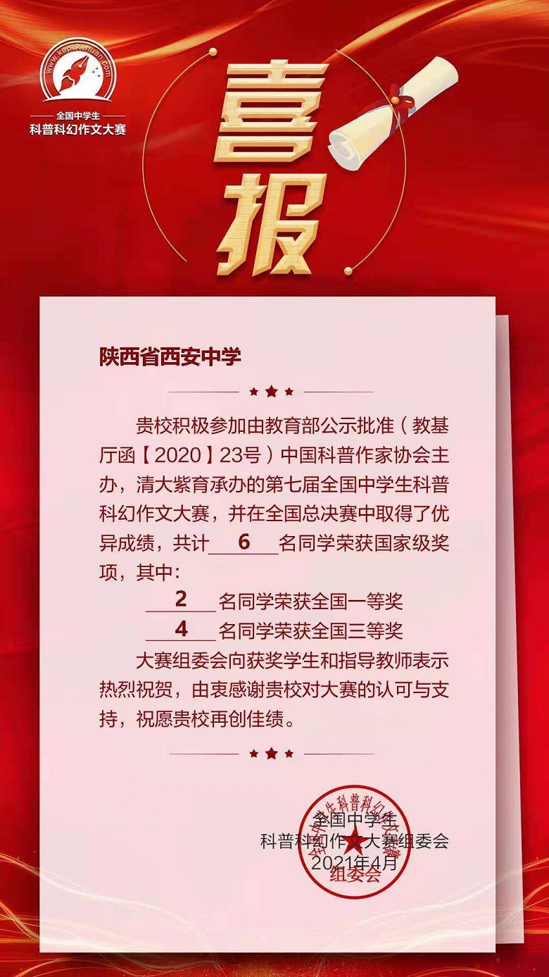 5月11日,第七届全国中学生科普科幻作文大赛组委会给学校发来喜报。在今年这项赛事中,西中学子共荣获全国一、二、三等奖6项,省级一二三等奖64项。
