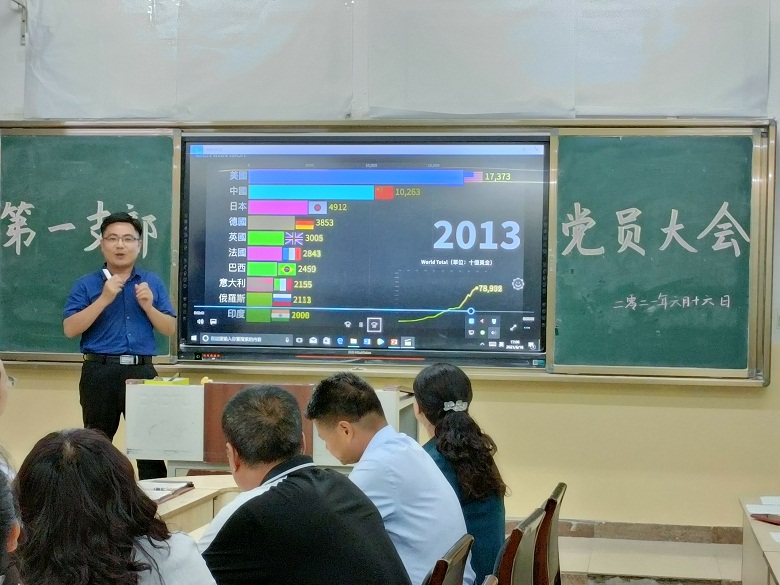会上,首先由支部书记刘卫为全体党员上党课。党课以《中华盛世 改革而来——将改革进行到底》为题,从改革开放的背景谈起,讲述了中国共产党如何领导人民拉开改革大幕,并带领同志们回顾了改革开放的历史进程和取得的伟大成就。课前播放的世界各国GDP变化动态图,让全体党员老师直观感受了中国速度、中国发展。四十多年来,中国共产党带领人民以一往无前的进取精神和波澜壮阔创新实践,让改革开放的大潮在神州大地上奏响激扬乐章。今天,我们比历史上任何时期都更需要改革开放带来的澎湃动能。将改革开放进行到底,努力创造更新、更大的中国奇迹,每一名共产党员都责无旁贷,重任在肩。
