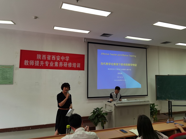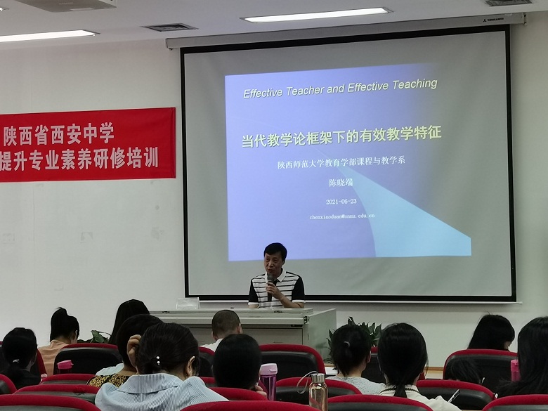 6月23日上午,“陕西省西安中学教师提升专业素养集中研修培训”活动第二场专家讲座在图书馆二层阶梯教室举办。本场专家讲座由陕西师范大学教育学院课程与教学系教授陈晓端倾情开讲,题目为“当代教学论框架下的有效教学特征”。讲座由教学处副主任杨毅主持,两校全体高三教师和部分高一、高二教师参加了培训。