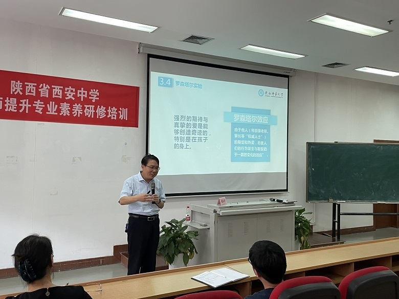 6月24日上午八点二十,陕西省西安中学“名校+”教师提升专业素养集中研修培训活动第四场专家讲座在图书馆二层阶梯教室如期举行。本场专家讲座由陕西师范大学物理学与信息技术学院教授张红洋倾情开讲,题目是“提升教师专业素养,促进学生健康发展”。我校高2021届全体教师及经开一中的部分教师到场聆听,我校教研处副主任樊兰君主持了本场讲座。