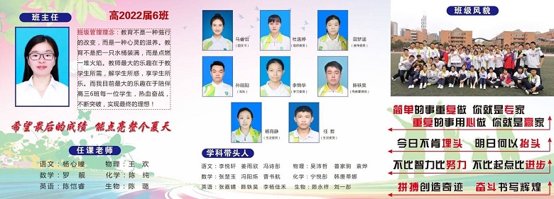 带班理念:教育不是一种强行的改变,而是一种心灵的滋养。教育不是把一只水桶装满,而是点燃一堆火焰。教师最大的乐趣在于教学生所需,解学生所惑,享学生所乐。而我目前最大的乐趣在于陪伴高三6班每一位学生,热血奋战,不断突破,实现最终的理想!希望最后的成绩,能点亮整个夏天!