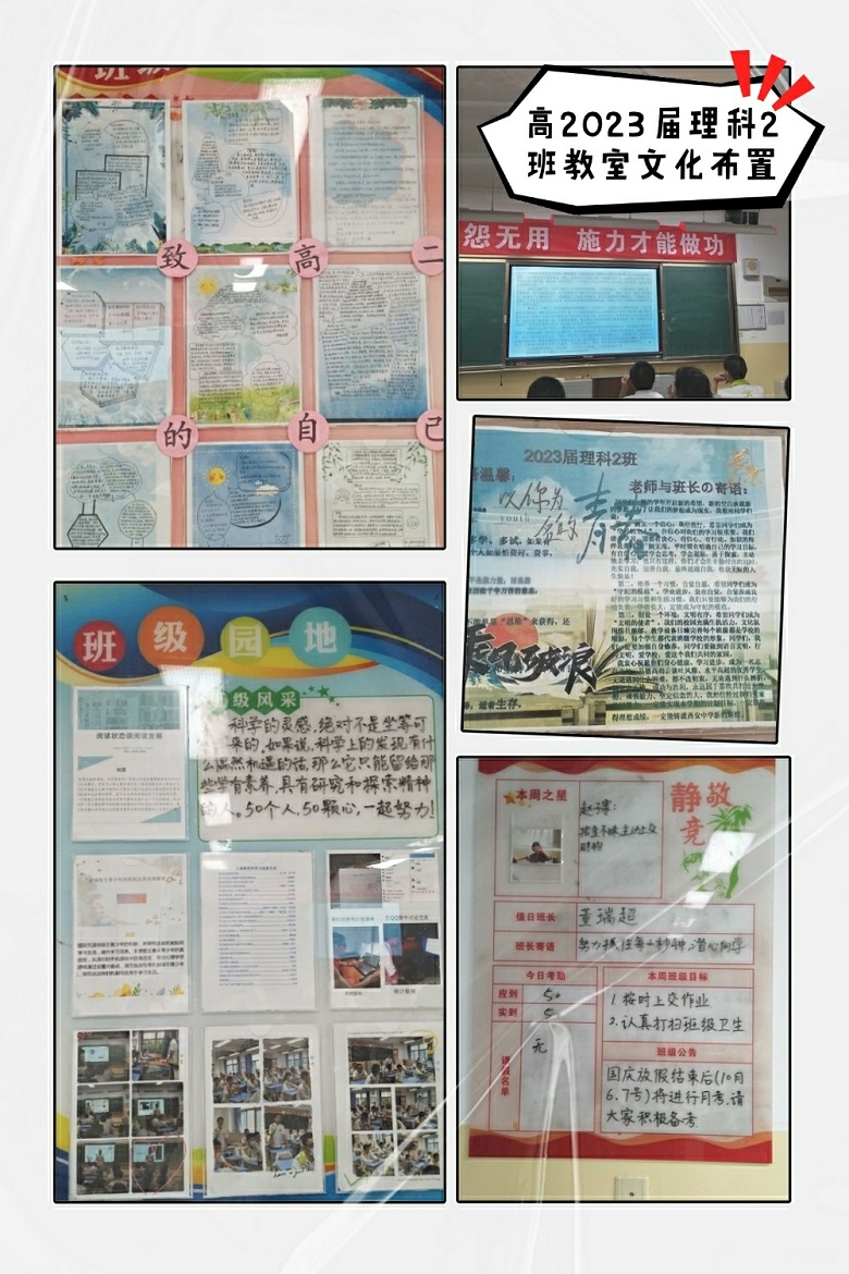 教室是学生日常学习与活动的主阵地。室内的物品不仅影响到学生的视觉感官,同时也影响着学生的理性认知,具有“桃李不言”的隐性教育功能。在近两周的班级文化建设中,高二年级各班从细节入手,重视教室环境的美化,力求让教室的每一面墙壁、每一幅标语、每一处展板都会“说话”。