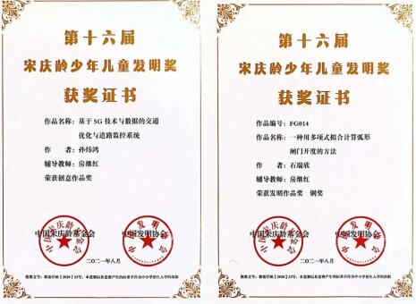 全国第十六届宋庆龄少年儿童发明奖终评答辩活动已顺利完成,我校高二六班孙炜鸿同学的作品《基于5G技术与数据的交通优化与道路监控系统》获全国创意作品金奖;高二二班石瑞欣同学的作品《一种多项式拟合计算弧形闸门开度的方法》获发明组作品铜奖。
