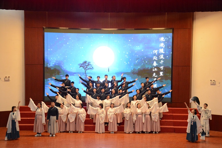 “春江潮水连海平,海上明月共潮生。滟滟随波千万里,何处春江无月明!”创10班表演《春江花月夜》将现场的气氛推向了高潮。随着音乐的律动,诵读者与舞者通过极富感染力的表演,用不同的方式共同演绎着这首“孤篇压全唐”的绝美诗歌,获得了全场观众的喝彩!