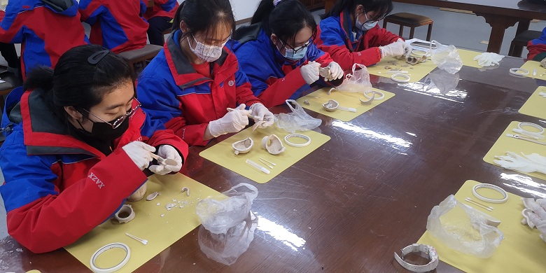 结合校内第二课堂考古选修课上学习的知识,社员们在专业人员的指导下进行了模拟文物修复,不管是色彩艳丽的来通杯,还是素雅朴实的陶罐,亦或是古人生活常见的陶碗,社员们都全心投入,观察、记录、清洁、拼接、固定、修补、打磨……原本破损遗失的器物又渐渐现出原貌,虽不是真的文物,但每位社员修复时都轻拿轻放,细致、耐心的样子像极了真正的文博专业人员。