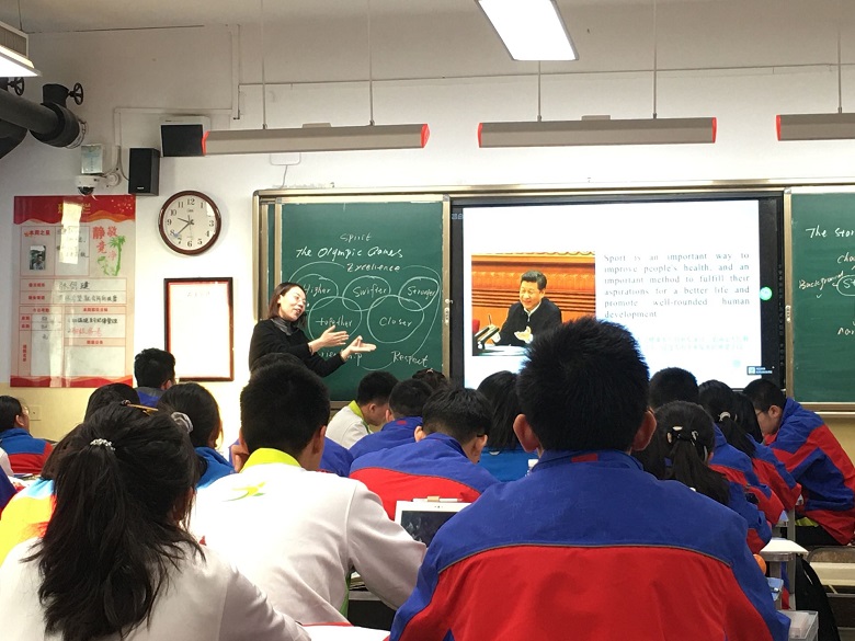 另一节杨艳老师的课是高一创四班的智慧课堂的常态课展示。虽然两节课选择同一个文章,但杨老师的课的思路却完全不同。杨老师主要以英语故事的篇章构成的分析为线索、以奥运会的精神为核心导向,对故事情节做以梳理与分析,并让学生演绎故事情节,将课堂推向了高潮。读后,通过两个问题的思考与讨论,升华文章传达的主题意义,即奥运会中的平等与尊重。另外,智慧课堂中教师使用平板随机提问学生,使学生的关注度与参与度更高。