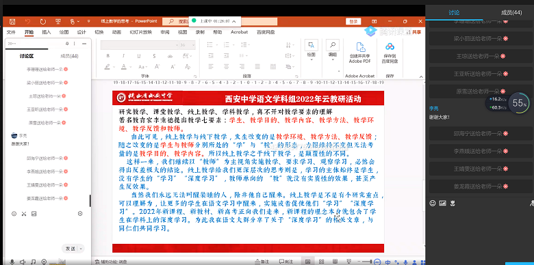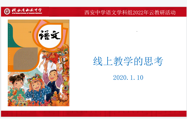 1月10日上午10点,西安中学语文学科组2022年首次云教研活动精彩上线,全体语文教师云端欢聚,分享教研心得。此次教研活动的研讨主题是“线上教学的思考”,学科组副组长尚武老师主持,来自三个年级备课组的王婧雯、樊佳玥、梁小丽老师做主题发言。