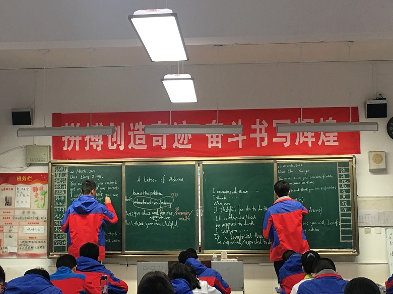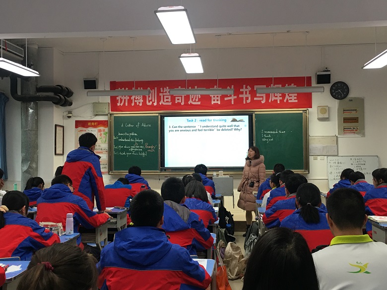 在彭霄老师精心准备下,这堂课无疑给每位学生及听课教师带来一次耳目一新的课堂体验。本节课取自2019人教版高中英语教材Unit 1 Teenage life, 课型是Reading for writing,教学目标是学生能够写出结构清晰、内容丰富、充满情感的英文建议信。彭老师以问题导入课堂主题,询问学生遇到困难时的求助对象。接着,呈现出班里三位学生的照片,让其他学生猜测他们的困难,从而创建了鲜活真实的解决问题的场景。同时,从情感上使学生融入课堂、思考真实的问题,并激发学生解决问题的驱动力,使课堂自然地展开。然后,用学生真实的录音分别讲述他们的问题,也激活了整个课堂,成为亮点之一。随后,进入阅读环节,彭老师首先让学生聚焦作文的几个内容要点,将作文的结构理清,接着,通过关注建议部分的内容,总结出三个具体的写作要点,即在具体的建议后需要进一步说明原因、示例或者结果以使得文章更具有说服力。随后,通过小组讨论的活动形式解决班级三位学生的困难,并最终形成书面表达。教师进一步对学生写作进行反馈与评价,达成教学目标。