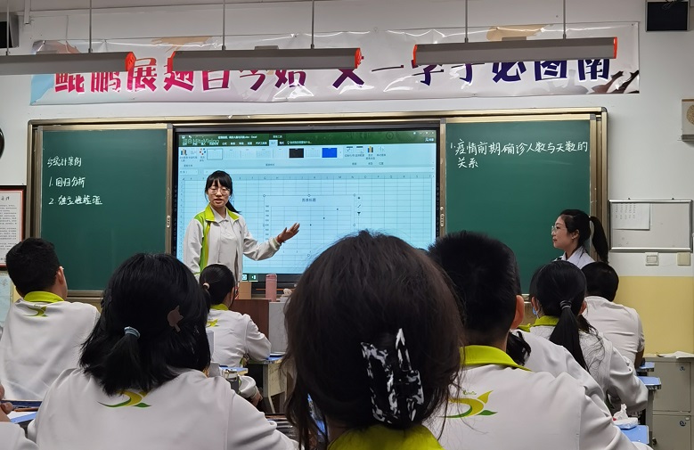 拓继雨老师通过疫情初期,确诊人数与时间关系的调查,引导学生掌握统计问题的过程与方法,感受我们国家以人民生命安全为首要任务,积极防疫的负责态度,深入感知中国精神、中国力量与中国担当。