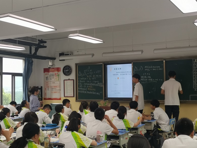 全体物理教师首先在高一理10班观摩了青年教师张兆阳老师的汇报课《动量定理》。张老师首先从生活实际出发,设计“落蛋”实验激发学生学习兴趣,形象生动,接着引导学生运用牛顿第二定律和运动学公式推导得出动量定理,并且巧妙设计一题多变,强化动量定理的理解应用,注重例题的解题规范,最后回归课前实验,使学生对“缓冲”这一概念有了深刻的认识。张老师教学功底扎实,教态大方,积极与学生互动,具有很强的亲和力,板书美观,教学内容重难点突出,在课后的组内评课中得到了所有老师的一致好评。