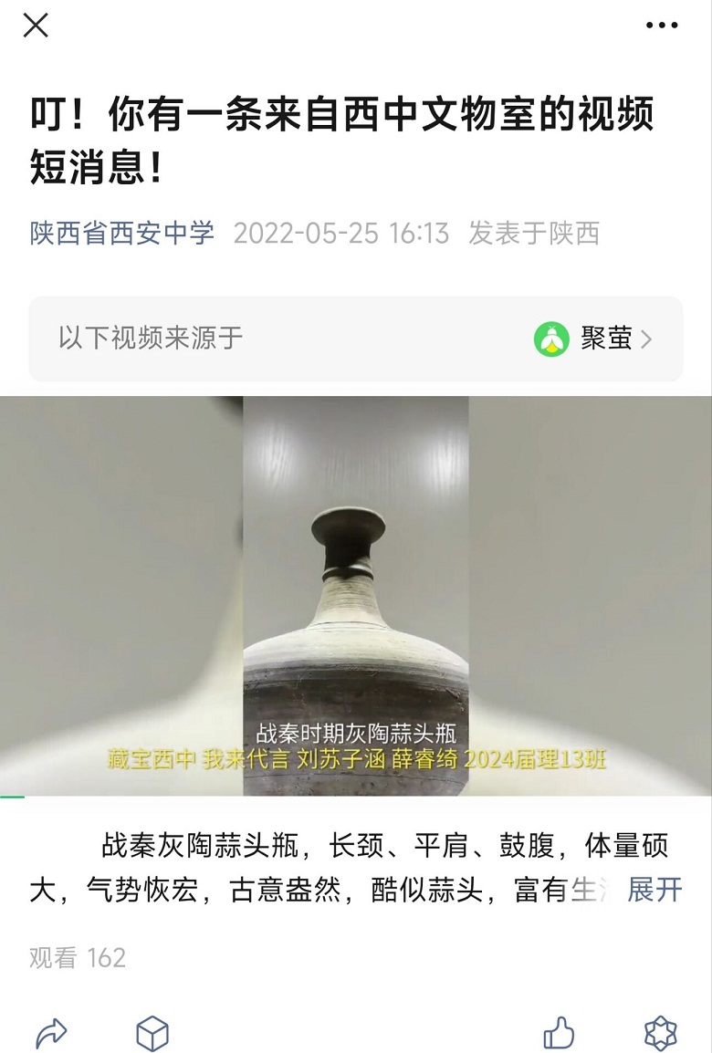 2022年5月24日至25日,西安中学考古+社全体社员在指导老师高山陪同下对西中文物室进行了参观学习并陆续制作了“藏宝西中·我来代言”系列文物宣传短视频,已通过校微信公众号等平台发布4期,期待大家的持续关注。