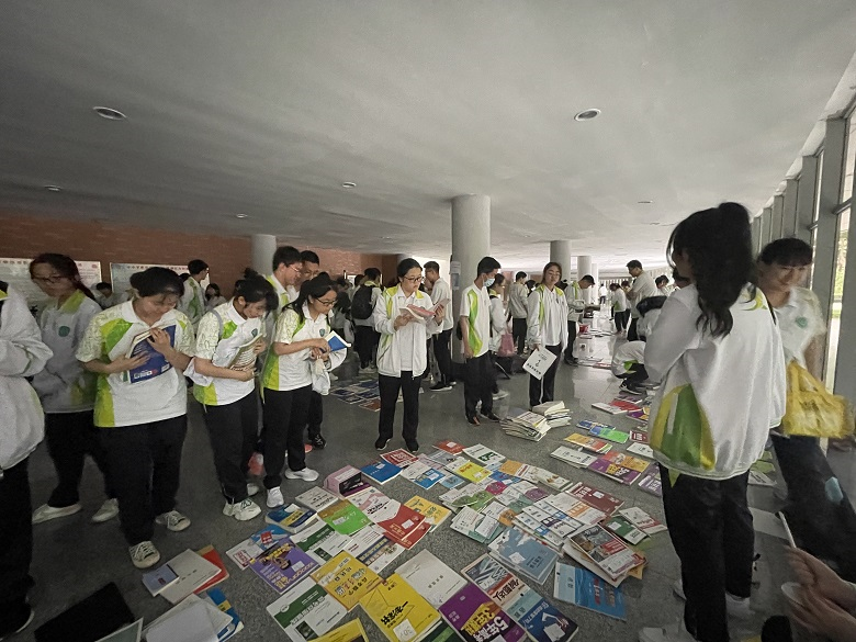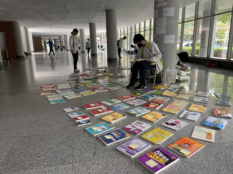12:15,高一高二一下课,教学南楼一层过道和学生宿舍楼前,活动现场立即人头攒动,“文科260+的秘密”,“师兄学姐的成功秘笈”,各种叫卖声和欢呼声此起彼伏,挑书的人络绎不绝,我校高2022届“跳蚤书市”火热开市啦。