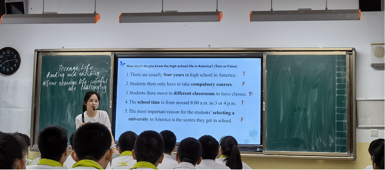 刘珍老师在高一理9班上了一节精彩新颖的阅读公开课,选题为新教材必修一第一课Teenage life,Reading and Thinking:The Freshman Challenge。刘老师以对西中校园生活的评价为导入,在真实语境中引出本课主题,并通过课前热身活动让学生了解到美国高中生活,学生兴趣盎然,形成阅读期待。在阅读中,刘老师循循善诱,引导学生通过定位段落主题句,关键词等阅读方法分析篇章结构,聚焦人物性格,把握文章大意。为了让学生对于美国高中有更加直观形象的认识,刘老师把文本内容和自身在美国高中的实习经历相结合,向学生介绍了美国高中的特色课程设置、学生导师制度等,对比中美高中异同,培养学生的跨文化意识。最后,刘老师通过美文《未选择的路》激励学生无惧挑战,无悔于心,为青春奋斗,升华主旨。本节课聚焦学科核心素养,以对比中美高中为线索,设置形式多样的阅读任务和学生活动,学生兴趣浓厚,课堂氛围活跃,获得了听课老师的一致好评。