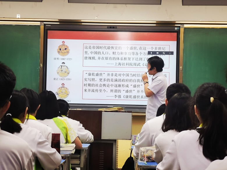在本节课设计中,左鑫老师以乾隆皇帝的功绩为导入,将教材重新解构整合,以“盛世之制”、“盛世之疆”、“盛世之忧”、“盛世之思”四个环节开展课程,使用了大量文献史料、地图史料,并兼以历史故事,体现了左鑫老师扎实的学科知识与深厚的教学功底。其中“盛世之思”中,要求学生思考“清前中期的康乾盛世是否名副其实”的环节得到了组内老师的高度肯定,充分落实核心素养,史论结合,培养学生的思辨能力。
