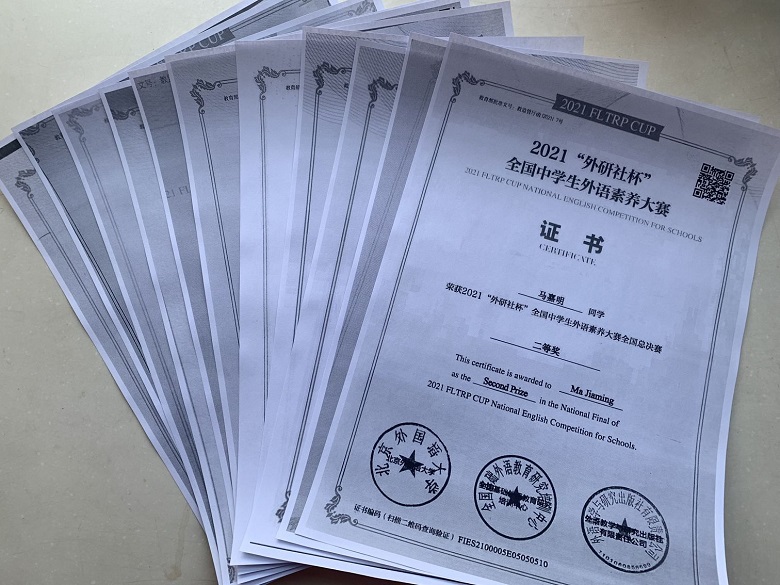 我校学生荣获2021“外研社杯”全国中学生外语素养大赛二等奖