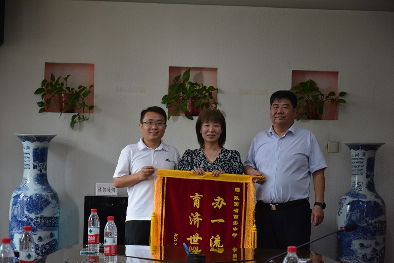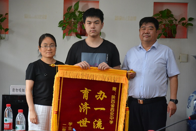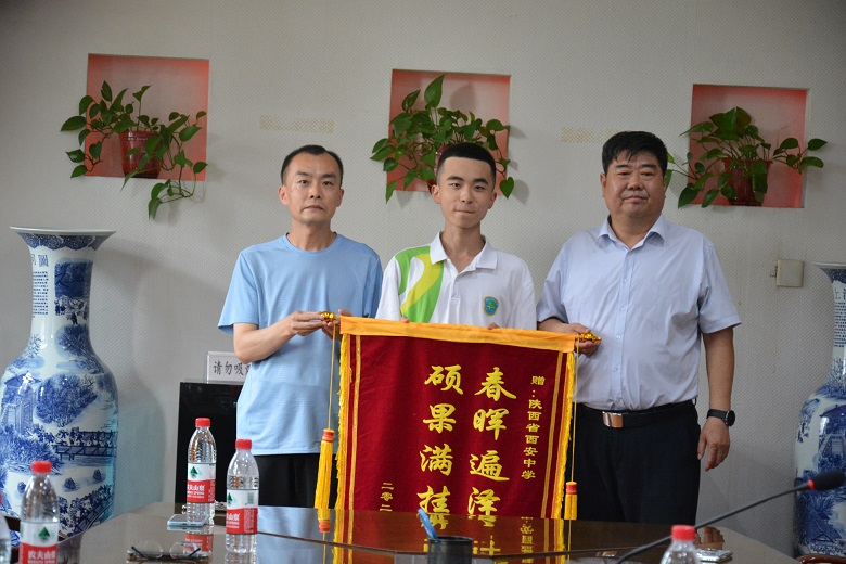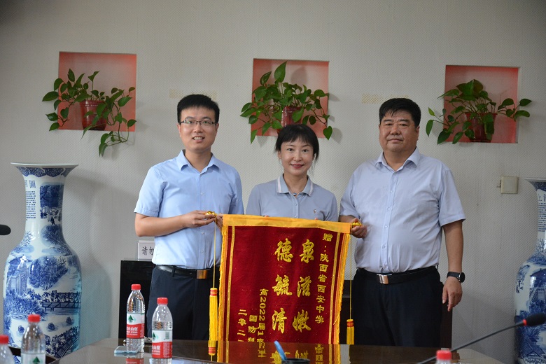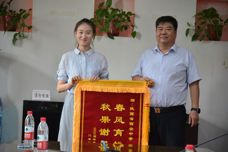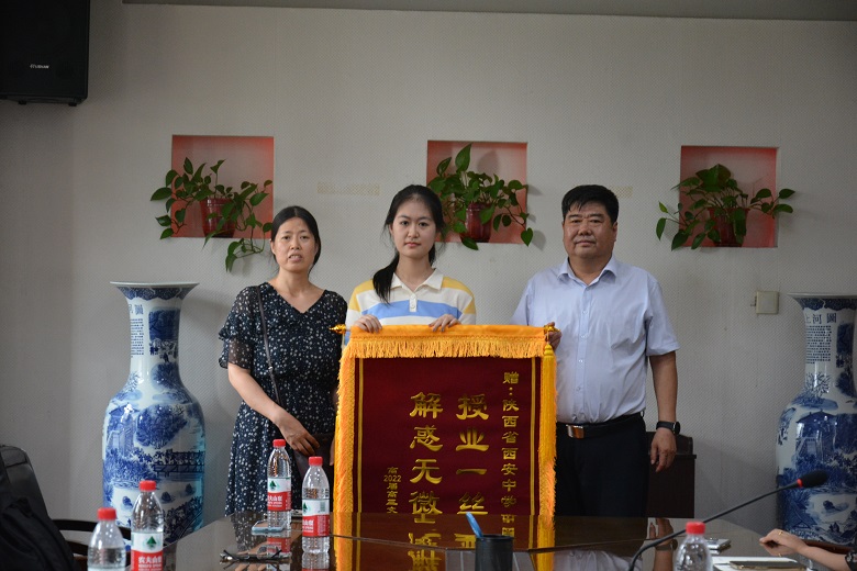 为梦想,春风化雨桃李艳;明未来,金榜题名捷报传。饮其流者怀其源,学其成时念吾师。2022年高考在战马奔腾的竞争中终落下帷幕, 三载辛勤耕耘,换得桃李芬芳。8月8日,西安中学高2022届优秀学生代表及家长来到学校,向学校汇报高考录取情况并赠送锦旗,表达对学校的感恩、感激之情。本次“饮水思源、感念师恩”的活动由高2022届年级马云云主任主持,张克强校长、薛锋副校长、薛党鹏副校长、黎建军主任、郑欣副主任、敖宏铭副主任和部分班主任全程参加,张克强校长代表我校师生一起接受锦旗,并与家长和学生进行了愉悦、轻松地交谈。
