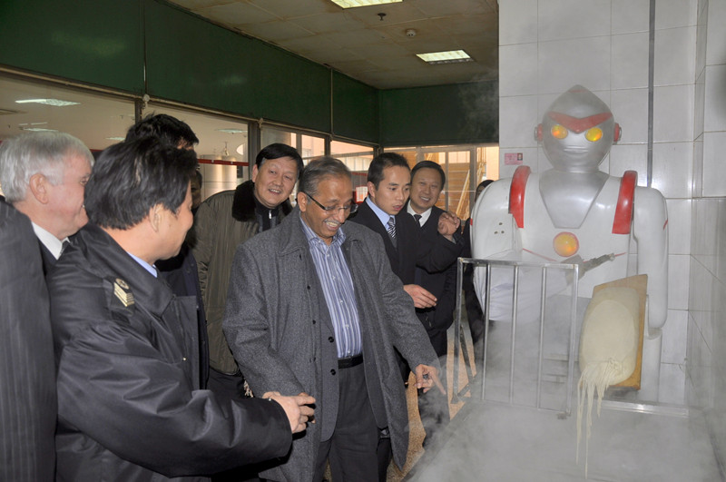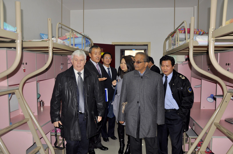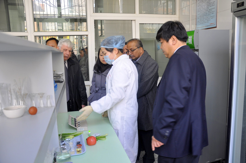 张克强校长首先对考察团的到来表示真诚地欢迎,对学校食堂的管理进行整体的介绍,之后带领考察团观看了食品原材料价格公示栏,考察团对我校食品公开化、透明化的管理制度表示认可。随后参观了食堂的原材料展示台,了解了我校食堂学生自主管理体系,观摩了消毒间、主食间、肉切间,对素切间中的土豆削皮清洗机与主食库防鼠台表示出浓厚的兴趣。在食品安全检测室中,观摩了食品的检测过程,食品检验员介绍了检验的种类,并展示食品留样。随后考察团一行进入标准化操作间,外宾对机器人炒菜区,这一智能化系统表示肯定。之后考察了调料库房,对我校调料的细分化管理有高度评价。考察团随后参观了教职工餐厅,考察人员对我校教职工餐厅的优雅环境及福利制度表示肯定,并在健康自测点上自测,认可细节之处对教师的人文关怀。最后参观了我校的学生宿舍,对宿舍的空调、饮水机,以及24小时热水供应,表示满意与赞赏。