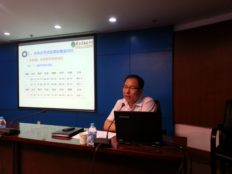 会议首先由陈昭亮副主任总结前半学期的教学工作。陈主任通过对期中考试成绩各科与总分详细数据的对比,从平均分和各档次人数两个不同的角度进行阐述,全面的分析了学生的学习情况,各班、各科之间的差距以及离理想目标的距离。陈主任进而分析了学生学习方面存在的问题,并对各位老师提出了希望和要求。第一,要扭转和改变学生的学习状态;第二,要认真研究教学内容的处理;第三,要以分层作业和作业课为抓手,抓学生学习任务的落实;第四,要把各档次的学生再向前促一个档次。最后,陈主任对后半学期的工作进行了安排,并鼓励老师们继续扎实工作,注重细节落实,追求教学实效,为年级教学质量的提升而努力奋斗。