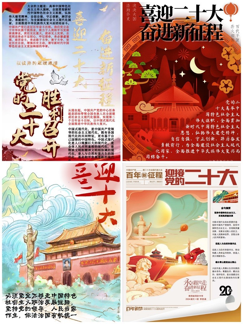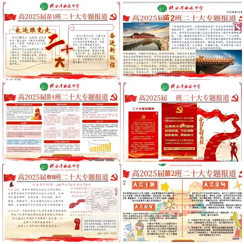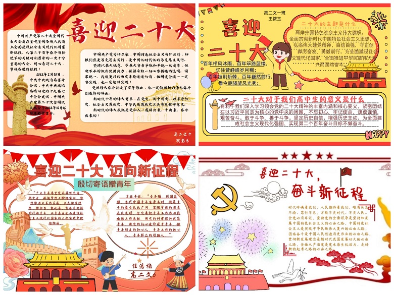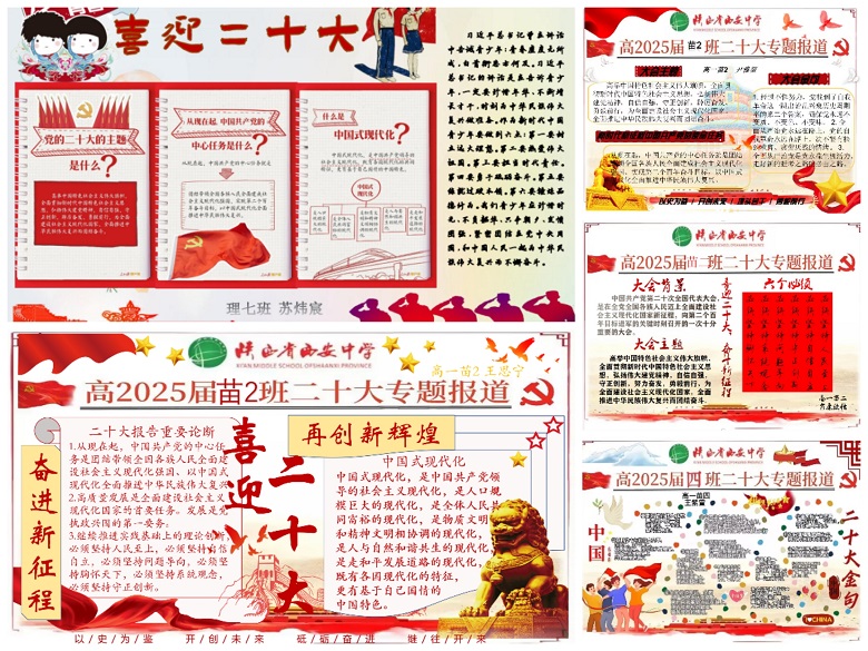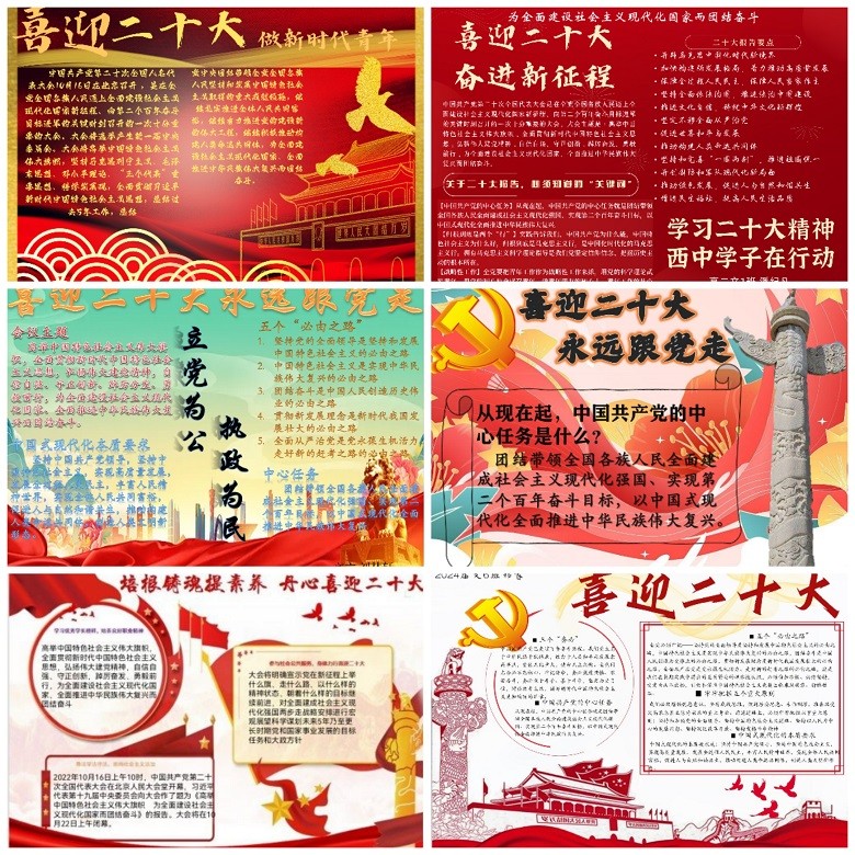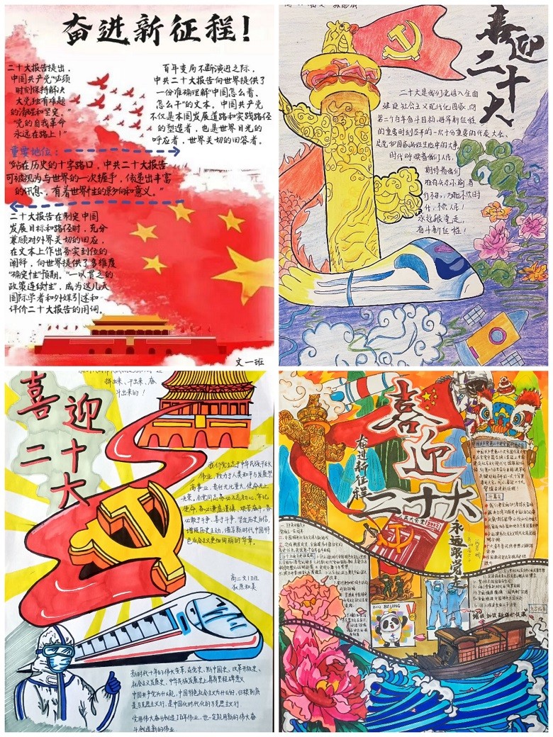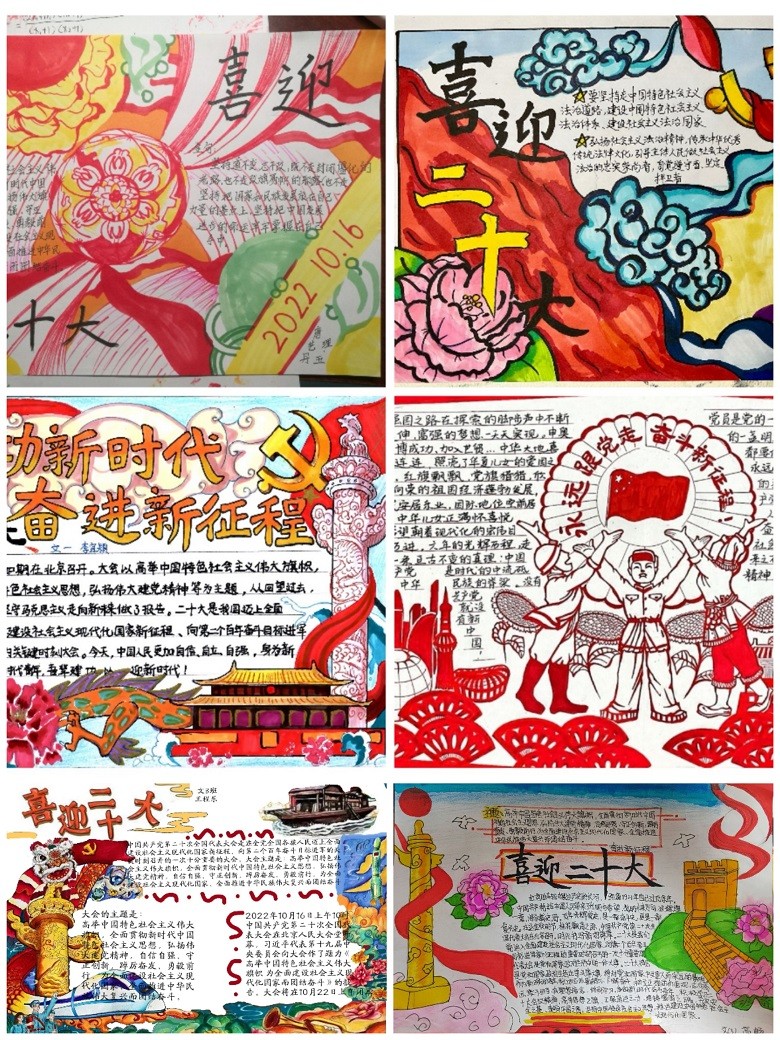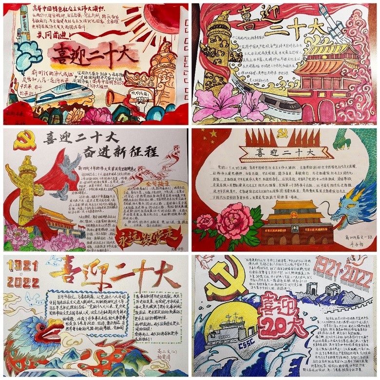 2022年10月16日上午,举世瞩目的中国共产党第二十次全国代表大会在北京人民大会堂隆重开幕,这是全国人民政治生活中的一件大事。我校全体学生在政治学科组组长刘金燕老师的统筹安排下,在各班政治老师的指导下,于10月16日上午十时,收听收看了党的二十大开幕式直播,同学们纷纷表示,党的二十大报告催人奋进、令人鼓舞,更加坚定了爱国爱党的政治立场,更加坚定了踔厉奋发,勇毅前行的决心,更加坚定了为实现中华民族伟大复兴贡献自己的青春力量的奋斗信念。由于疫情影响,同学们不能在学校当面和老师同学分享心得体会和感悟,于是在居家持续关注大会进展和新闻报道的同时,积极动手绘制了党的二十大相关专题报道的手抄报,助推党的二十大精神在西中校园落地开花。