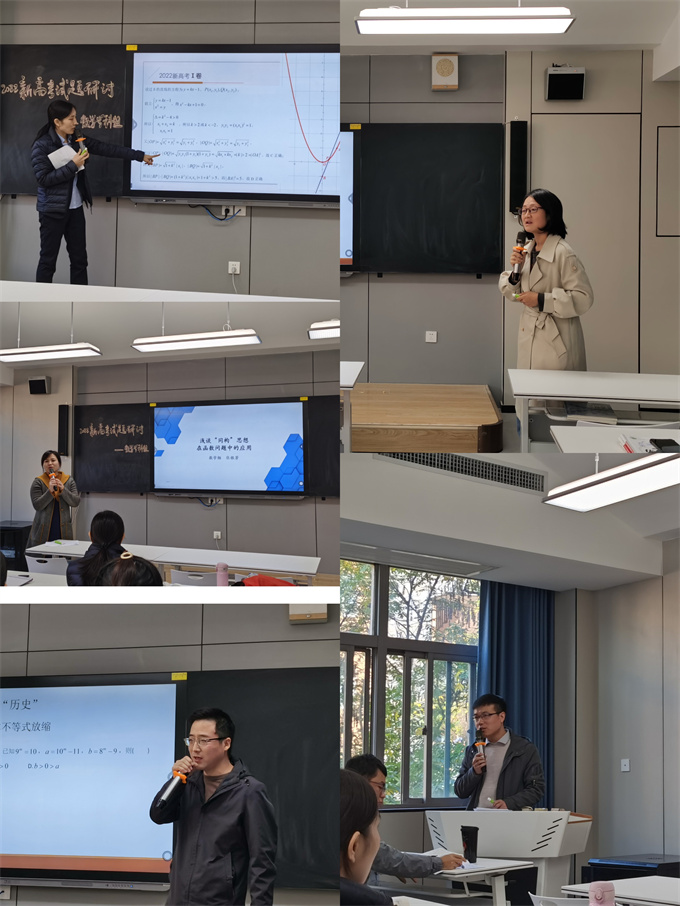张银芳老师分享的题目是《同构法在函数中的应用》,张老师从比较大小的问题出发,讲解函数问题中同构法的应用,张老师指出,近年函数大题在考察中切题点新颖,能力提升明显。陈晓曙老师分享的题目是《新高考圆锥曲线选填压轴题》,从考题-考试-备考-教学等环节,对相关试题进行系统分析。李超老师发言的主题是《比较大小》,李老师从比较大小题型的发展历史,处理策略,命题趋势三大方面逐一作出分享。赵昕媛老师分享的题目是《概率与统计问题》,赵老师从高考考察内容,教学策略等方面分享自己的见解。郑欣老师分享的题目是《宁在创新中碰壁,不在守旧中躺平》,从高考试题情境创设,多项选择题做法技巧两大方面与全体教师交流分享。