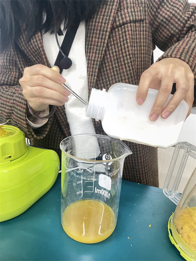 操作过程中一遇到问题,大家便集思广益一起想解决方案,推动着探究实验的进行,每位同学都是这堂课的主人。如榨汁机榨的汁少怎么办?将橘皮撕碎后榨汁效果仍不理想怎么办?同学们各抒己见,最终一致决定手动榨汁。榨汁过程每个学生都很投入,整个教室也散发着淡淡的橘子清香。