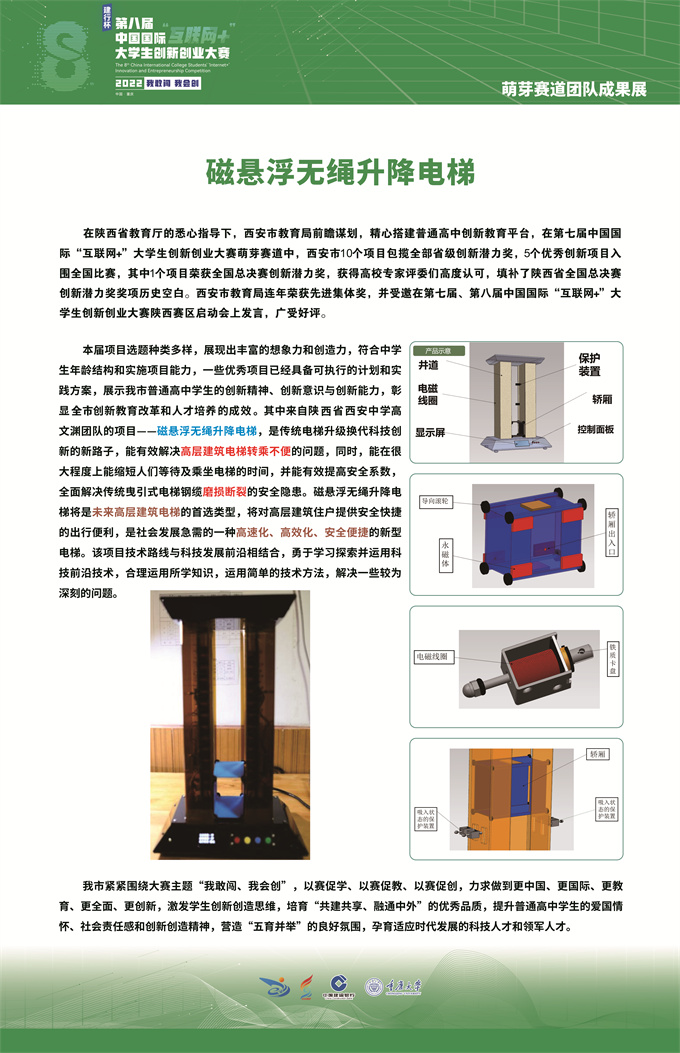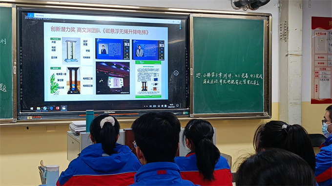 2022年12月2日晚6:30——6:50,萌芽赛道获奖作品在高一高二年级各班教室通过一体机放映的形式进行展示,西安中学高文渊、付筠格两名学生在王立晨老师的指导下,独立自主制造出一款磁悬浮无绳升降电梯。西安中学杨佳仪、张同蕾两名学生和西安市铁一中学三名学生,跨校合作搭建出一个基于校本资源交流共享新模式的在线学习平台。西安中学田秋晨、亢梓鑫、高雨泽、魏子哲四名同学利用信息学知识,搭建起校园小程序助力“跳蚤书市”二手书校园交易活动。宣传视频详细为同学们介绍了创新创业比赛萌芽赛道的由来,以及获奖团队从立项到逐步打磨完善最终取得优异成绩整个过程,同学们在惊喜和崇拜之余,更深深感悟到:知易行难,久久为功!