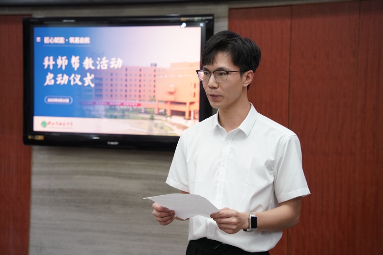 新入职教师代表张志鹏表达了对学校以及前辈教师们的真挚感谢。他代表全体徒弟承诺,会以师父为榜样,争取早日从‘站稳讲台’到‘站好讲台’,不辜负学校和师父们的培养。