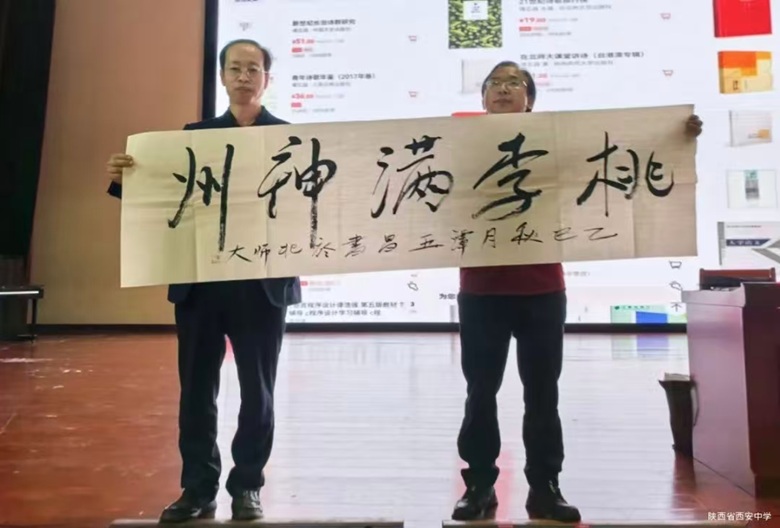 报告结束后,谭教授为我校赠送“桃李满神州”的书法作品,并为参与互动的学生颁发纪念品。