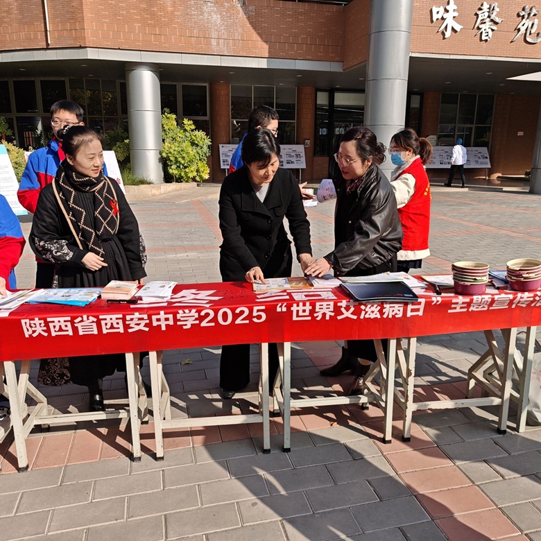 2025年12月1日,是第38个“世界艾滋病日”,今年的宣传主题是“社会共治,守正创新,终结艾滋”,强调了在全球艾滋病防治工作中凝聚社会合力、坚持科学创新、迈向最终目标的重要性。为深入贯彻落实这一主题,提升我校师生对艾滋病的科学认知与自我防护意识,营造积极参与、消除歧视、关怀生命的校园氛围,我校于12月1日中午在学校餐厅门口举办了防艾主题宣传活动。本次活动得到了左宏莉副校长、付斌校长助理、学生处安秀萍主任、学生处刘欣副主任等多位领导的高度重视与现场支持,张家堡社区卫生服务中心的两位工作人员也到场参与本次活动。