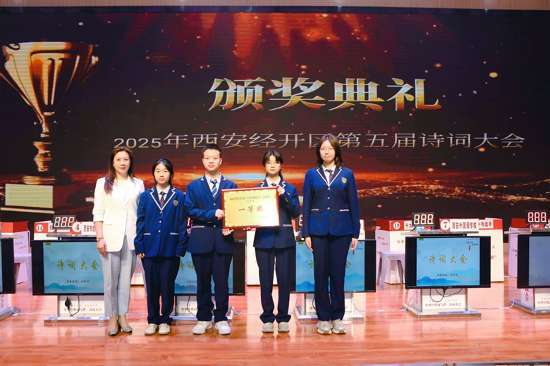 近年来,我校积极响应西安市“唐诗之都”文化品牌建设,持续开展唐诗进课堂、经典诵读、诗词社团等系列活动,营造了浓厚的诗词学习氛围。学生在各级各类诗词比赛中屡获佳绩:今年5月,2026届席浩洋、徐祯妮、许新维、方筱钰四位同学代表学校荣获经开区中华经典诵写讲诗词大会一等奖;9月,在西安市诗词大会中取得三等奖的优异成绩,学校亦被授予“优秀组织单位”称号。