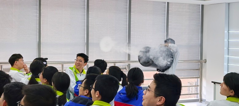 活动现场,科技馆孟祥瑞老师以生动幽默的语言、精巧安全的设计,把课本上枯燥的物理定律、化学原理 “搬” 到讲台之上。掌上火焰轻盈跃动,揭秘燃烧与安全的科学边界;怒发冲冠凭借静电魔力,让头发根根直立,直观诠释静电原理;会飞的蛋挞皮借助气流与压强,上演轻盈 “空中芭蕾”;炮弹风云以趣味模拟展现气体膨胀与动力原理;氦气变声瞬间切换 “卡通音调”,揭示气体密度与声音传播的奥秘;液氮蘑菇云腾起阵阵白雾,将低温相变现象化作震撼视觉奇观。
