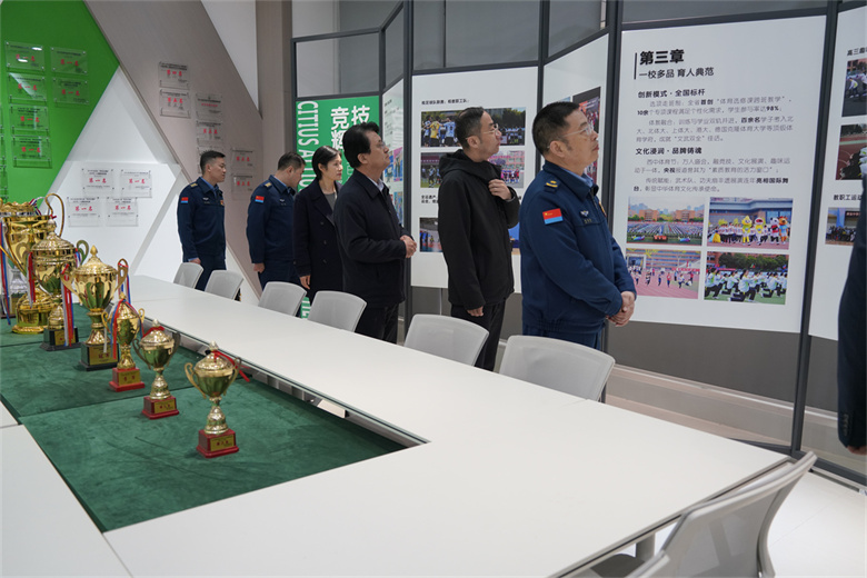 调研期间,空政领导一行先后参观学校青少年航空学校荣誉展室、西安中学历史文化展馆、科创中心、体育馆、“十四运”展馆、体育荣誉室及校史馆,细致察看校园育人环境,深入了解学校红色铸魂、航空赋能、军事励体、文化强基四大育人体系落地实效,并与一线教师、驻校干部亲切交流,全面掌握办学细节与人才培养质效。