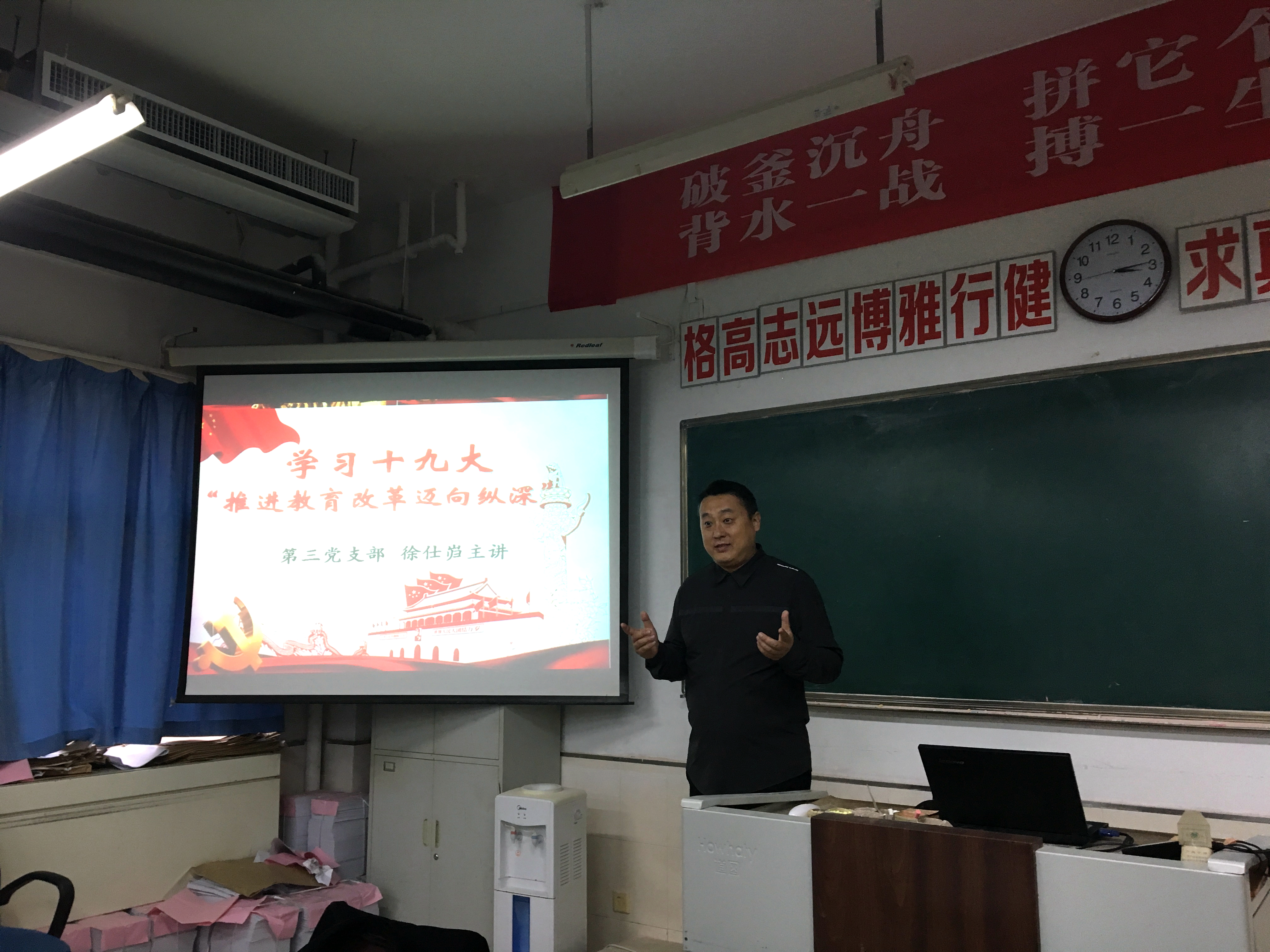 会议由支部书记徐仕岿主持。会议伊始,徐仕岿书记倡议大家以热烈的掌声祝贺十九大的顺利闭幕,并带领第三党支部党员认真学习了习近平总书记十九大报告中教育内容的表述,支部党员认真聆听并作了记录。会议第二项组织委员苟莉莉通报党小组分组安排并布置了党员导航任务,宣传委员原雪安排了党员学习笔记相关事宜。会议第三项是支部书记讲党课,徐书记结合教育部长陈宝生在“2017年全国教育工作会议报告”的相关内容为支部党员上了一堂精彩而生动的党课。